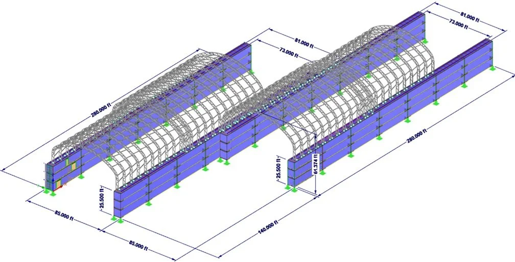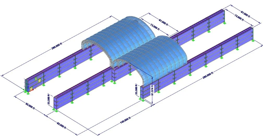 The structural study moved beyond individual module checks and into system-level coordination. The design incorporated long-span curved roof forms supported by the modular side structures, creating a relationship between enclosure geometry and primary support behavior that had to be carefully modeled. The spacing of supports, stiffness of the side walls, framing continuity, and force transfer between elements all became critical.