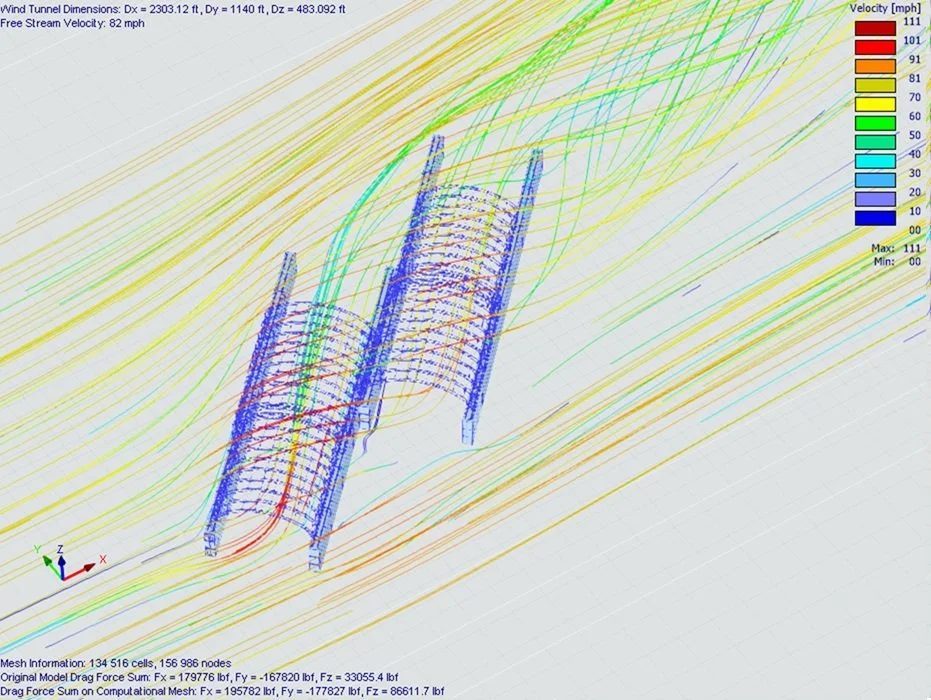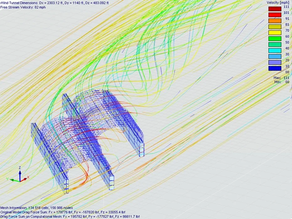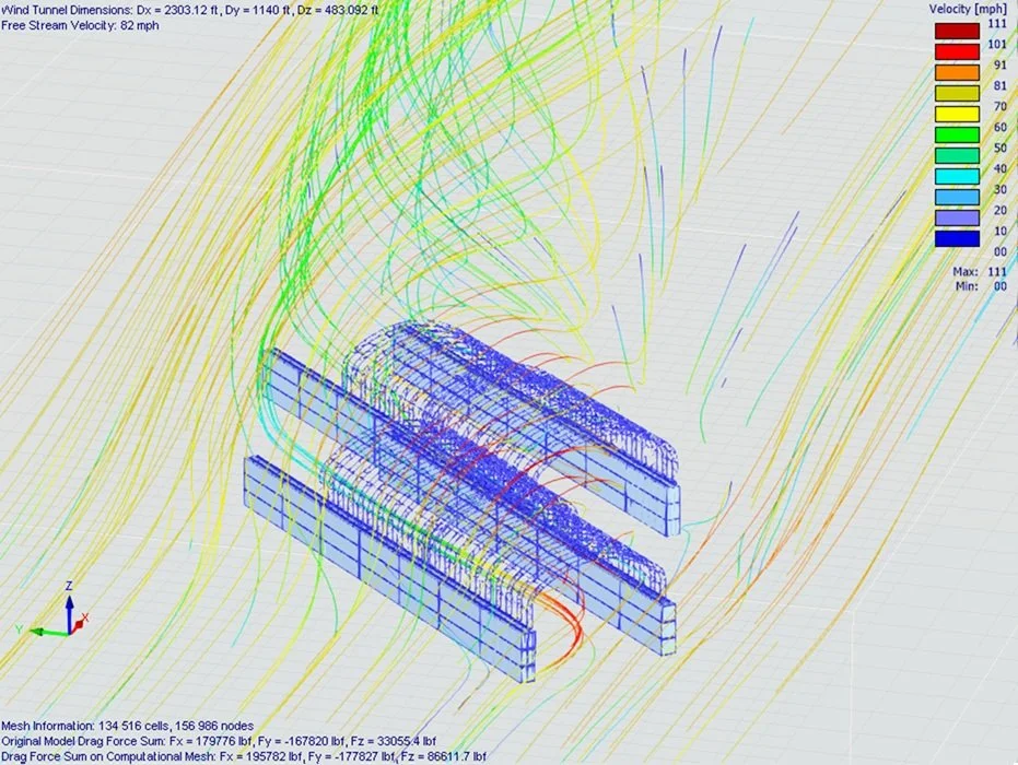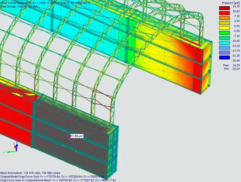 Wind added another important layer. Projects with unusual geometry, long open spans, and partially enclosed forms can behave very differently from conventional box-shaped buildings. For that reason, the engineering effort included detailed wind review supported by computational airflow analysis. Pressure mapping and streamline studies helped illustrate how wind moved around the form, where localized pressures increased, and how the spacing and shape of the structures influenced the overall response.